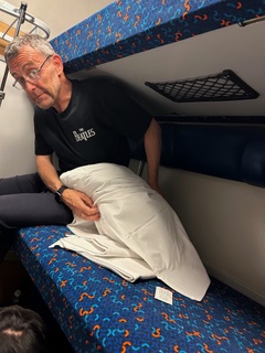 Although a four-berth, the compartment was laid out as two triple-bunk couchettes and our sleeping companions, who were actually a very sweet 20-something couple from New York, had been allocated the bottom bunks. Charles and Amy discreetly busied themselves preparing for sleep and exchanging disarming pleasantries with us while politely trying to ignore a couple of creaky, seized up near-pensioners’ panting and grumbling efforts to manoeuvre themselves into the upper bunks.